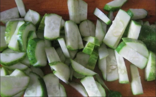 - Snijd verse en sterke komkommers in blokjes. Als de groenten groot en iets overrijp zijn, schil ze dan eerst en verwijder de zaadjes.