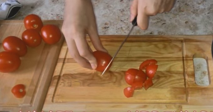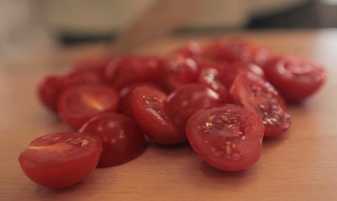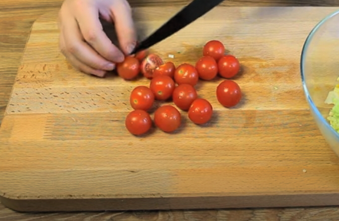 - Verdeel de cherrytomaatjes in twee helften en doe ze in een slakom.
