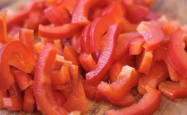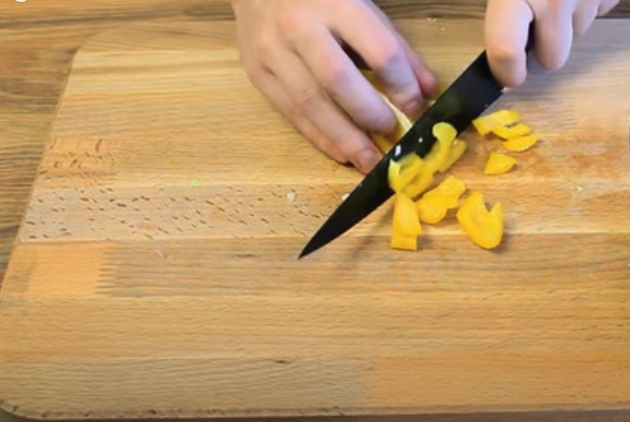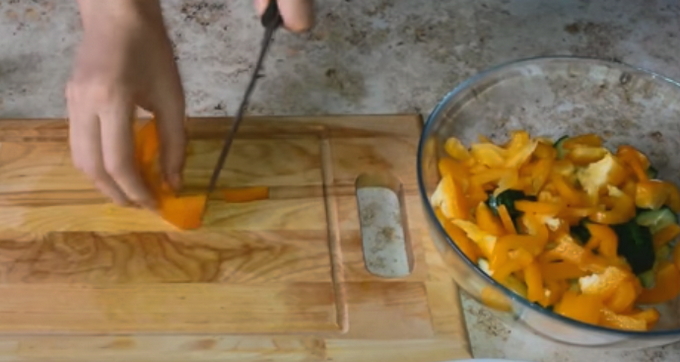 - Snijd de peper in reepjes. Peper kan in verschillende kleuren worden genomen, dan wordt de salade kleurrijk.
