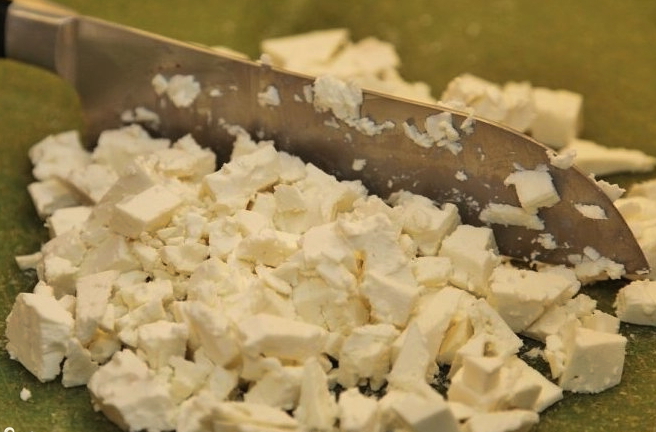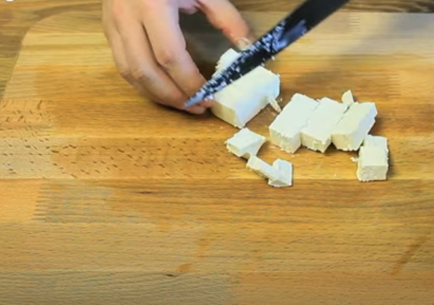 Snijd de fetax kaas in blokjes van ongeveer 2x2 cm Het is aan te raden het mes vooraf in koud water te bevochtigen zodat de kaas er niet aan blijft plakken.