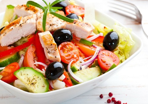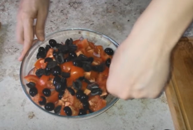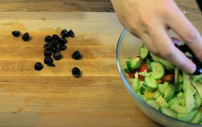- Combineer alle groenten in een diepe slakom. Voeg de ontpitte olijven toe.Ze kunnen naar wens worden vervangen door olijven of kappertjes.