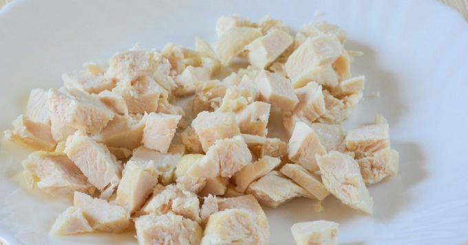 - Kook de kipfilet in water gedurende 40 minuten. Koel af en snij in blokjes. Doe in een container waar de componenten van de salade worden gemengd.