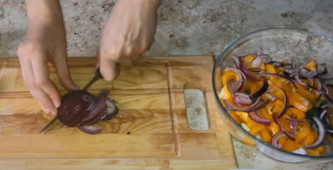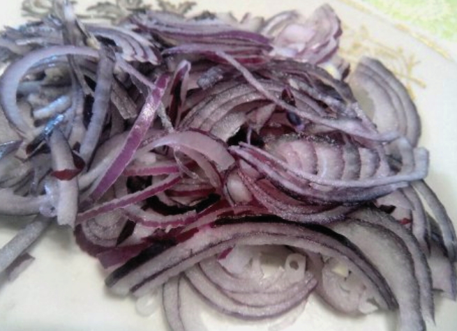 - Snijd de ui in blokjes, halve ringen of ringen - zoals je wilt - en giet het in een bak met andere ingrediënten. De optie van een salade zonder uien is toegestaan, evenals het vervangen van rood door traditionele uien of groene uien.