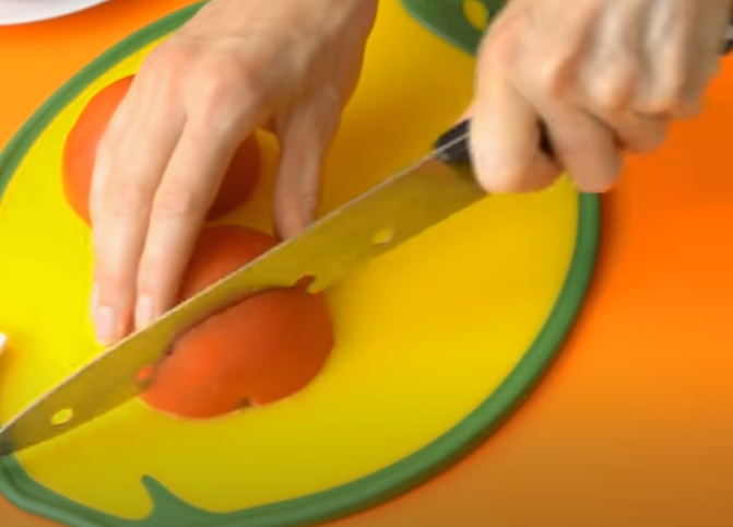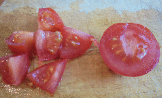 - Snijd de tomaten in stukjes en verwijder de zaadjes samen met de vloeibare kern. Snijd de elastische pulp in reepjes of repen.