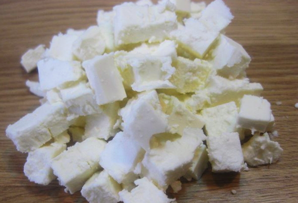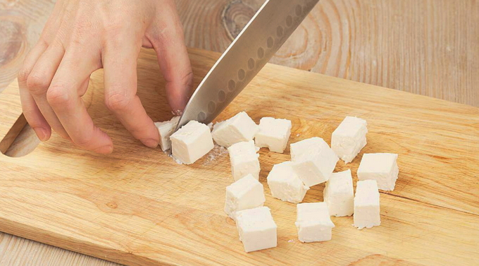 - Snijd de kaas in blokjes. Als het heel zacht is, kun je het na het roeren van de rest van de ingrediënten aan de salade toevoegen. De hardere kwaliteiten mogen samen met andere producten worden gemengd.
