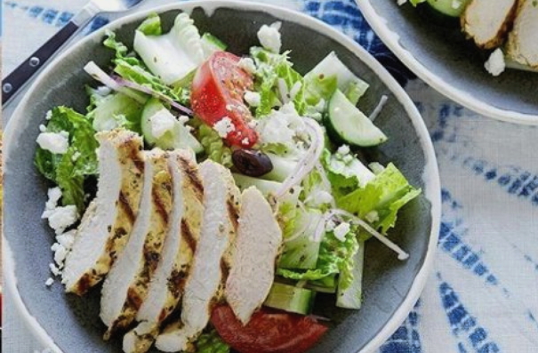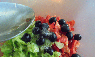 Bestrooi de salade met een beetje peper, je kunt een beetje zout toevoegen en dan de olijf-citroendressing erop gieten. Serveer het gerecht zonder de ingrediënten te roeren.