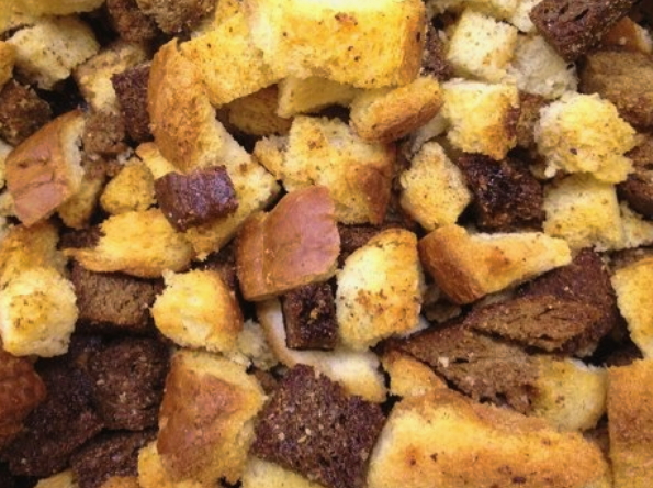 - Bereid croutons voor - voor het geval u geen kant-en-klare croutons gebruikt. Om dit te doen, snijdt u het brood in blokjes, nadat u eerder de korst hebt verwijderd. Leg het op een bakplaat en besprenkel met plantaardige olie. Droog ongeveer 5-7 minuten in de oven op 200 graden. Je kunt croutons ook in een koekenpan koken, het belangrijkste is om niet veel olie te geven. Als je kant-en-klare crackers neemt, kies dan een product zonder een uitgesproken buitenlandse smaak.
