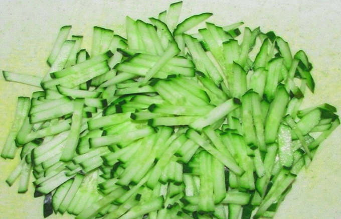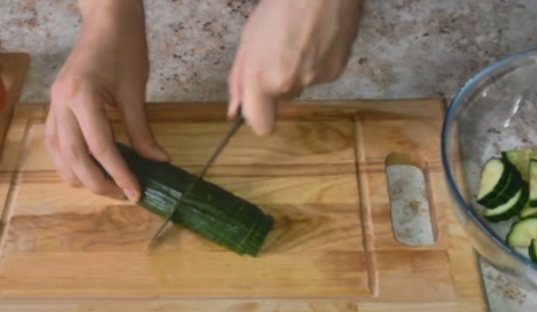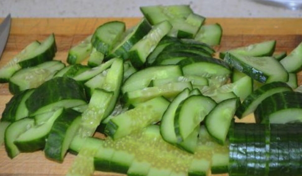 - Snijd de komkommer in grote stukken en stuur naar de salade.