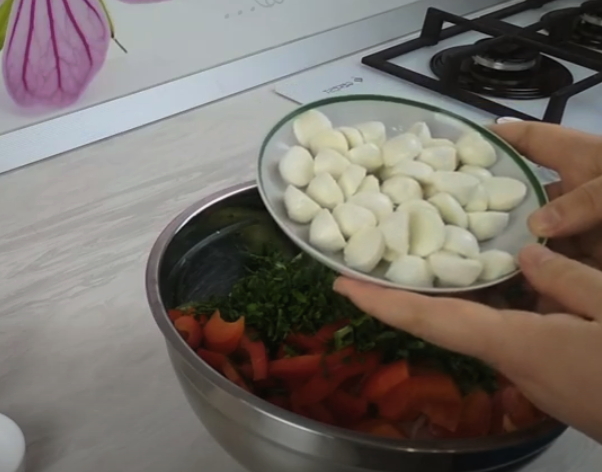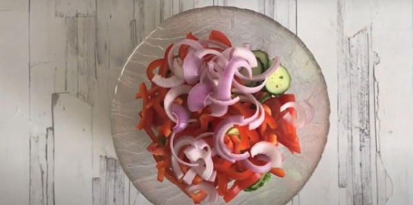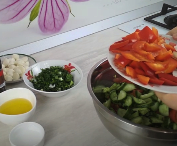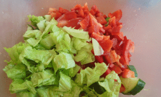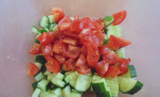 - Voeg de in blokjes gesneden komkommer toe aan de groenten. Doe hetzelfde met paprika.
