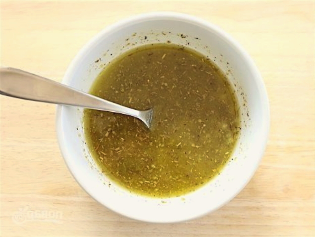 - Meng in een pan of glas olijfolie met citroensap of balsamicoazijn, voeg kruiden toe, meng alles.