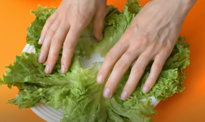 Bereid een gerecht voor om salade te serveren - het moet vrij breed zijn, maar niet diep. Leg er gewassen hele slablaadjes op.