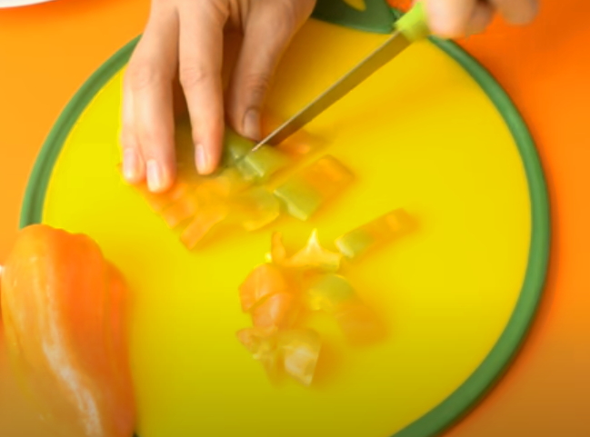 - Peper (bij voorkeur geel of oranje), schil van zaden en stengels, snij in blokjes en doe in een gewone container.