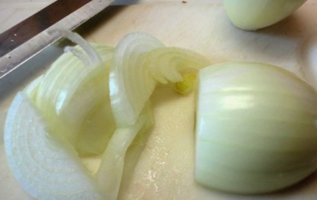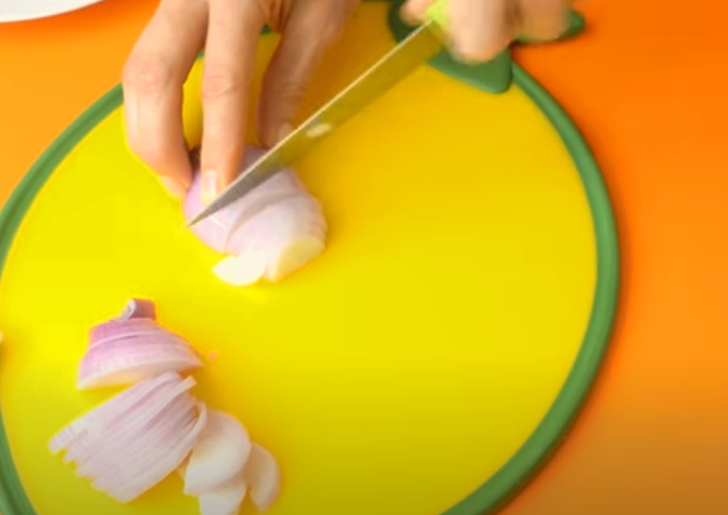 - Draai de ui met een scherp mes in reepjes of halve ringen.