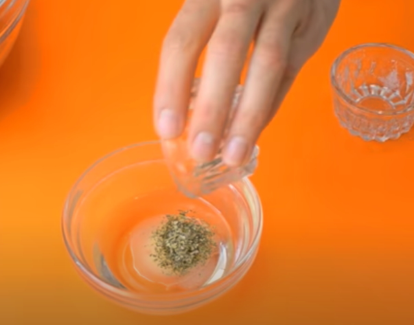 Giet kruiden bij een mengsel van olie en citroensap: oregano, basilicum en rozemarijn, roer de dressing erdoor.