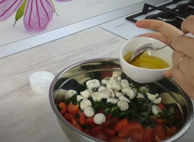 - Maak een saladedressing met twee ingrediënten: citroensap en olijfolie. Giet het mengsel bij de salade, voeg zout, basilicum, oregano, peper toe en roer.