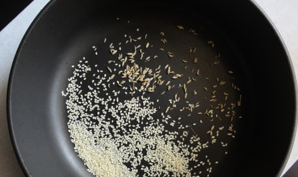 - Bak de sesamzaadjes 1-2 minuten in een droge koekenpan of gebruik ze rauw. Strooi ze over de salade.