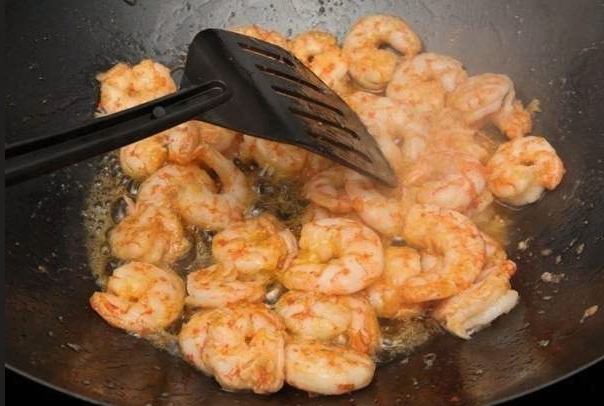 - Spoel en droog de gepelde garnalen. Verhit een lepel plantaardige olie in een koekenpan, plet er een teentje knoflook in. Doe de garnalen in de pan, bak ze op middelhoog vermogen, zet het vuur lager en houd ze een paar minuten in een open pan. Koel door op een bord te plaatsen.