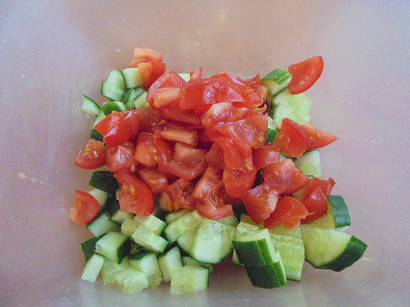 - Combineer komkommers, in repen gesneden, met tomaten.