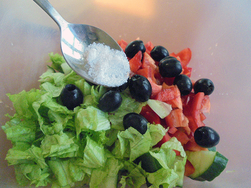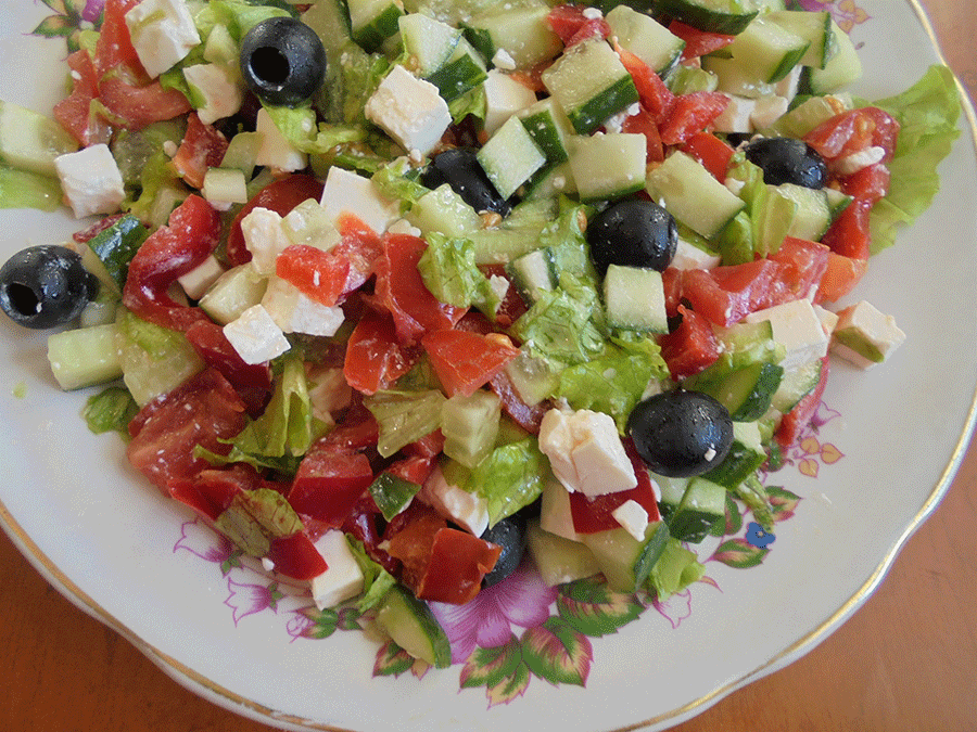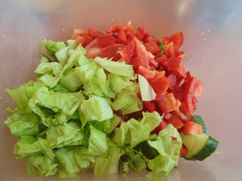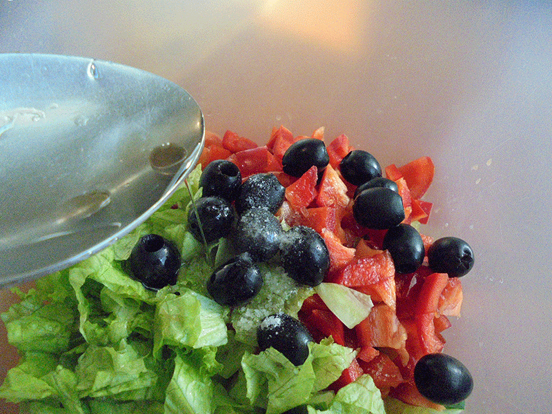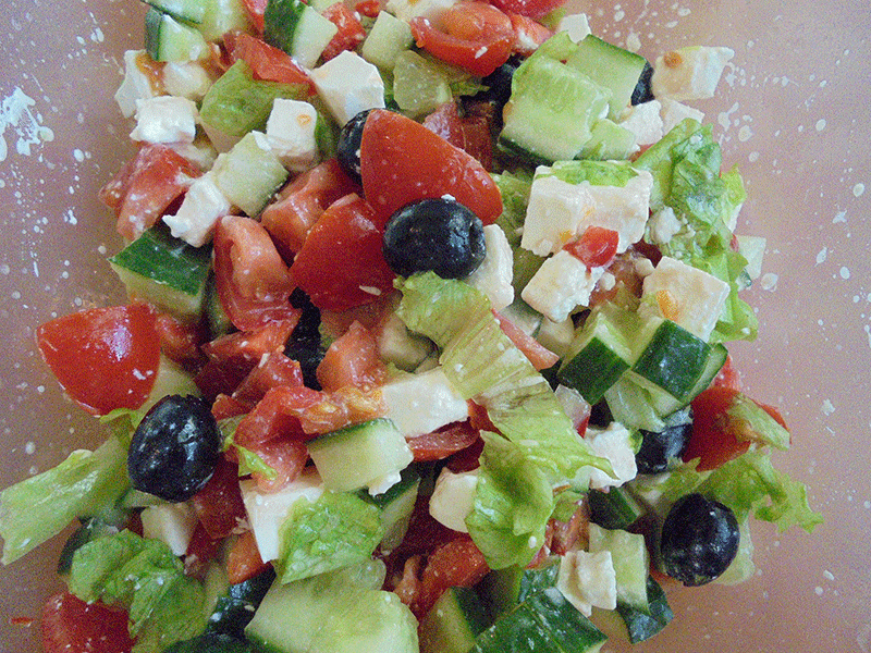 - Meng alle groenten en sla in een diepe kom, voeg de olijven toe en voeg de in blokjes of reepjes gesneden kaas toe. Kruid met peper en zout.