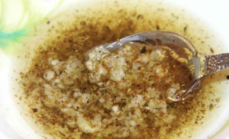 - Meng zout, gemalen peper en gedroogde Provençaalse kruiden met plantaardige olie en maak een schenking. Trouwens, kruiden kunnen vers zijn, dan moeten ze fijn worden gehakt.