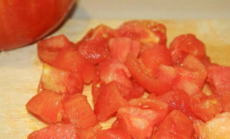 - Voeg 2-3 in blokjes gesneden tomaten toe aan deze groenten. Je kunt het vel eraf halen, of je kunt het laten zoals het is.