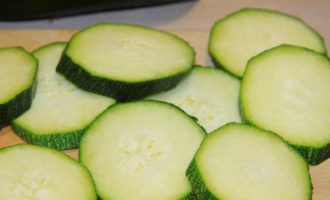 - Snijd verse tomaten en courgette in dezelfde cirkels, het moet jong zijn met een dunne schil die niet geschild hoeft te worden.