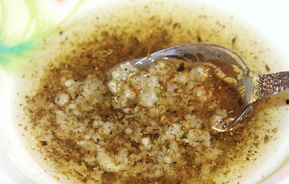 - Meng zout, gemalen peper en gedroogde Provençaalse kruiden met plantaardige olie en maak een schenking. Trouwens, kruiden kunnen vers zijn, dan moeten ze fijn worden gehakt.