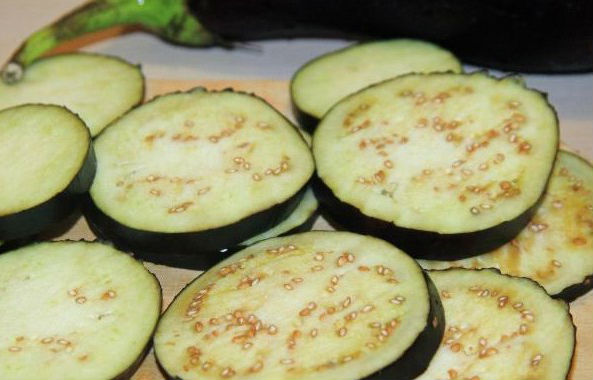 - Snijd schone en droge aubergines zonder staart in cirkels van 0,5 cm dik. Als ze bitter zijn, bestrooi dan de aubergines met zout en laat ze 20-30 minuten staan, spoel ze daarna af met koud water en knijp ze uit het vocht.