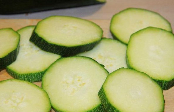 - Snijd verse tomaten en courgette in dezelfde cirkels, het moet jong zijn met een dunne schil die niet geschild hoeft te worden.