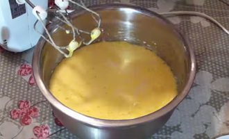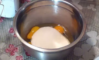 Laten we een diepe kom voor het deeg maken. Om te beginnen rijden we eieren, zout erin en voegen kristalsuiker in porties toe, malen het mengsel totdat de suiker volledig is opgelost.