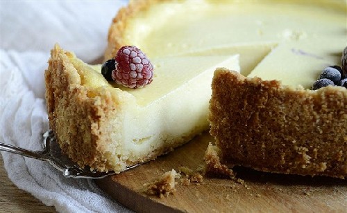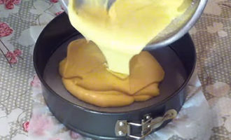 - Giet de room in een vorm en stuur deze naar de oven om 40-45 minuten te bakken. Het deeg moet goed bruin zijn, maar de vulling mag een beetje vloeibaar zijn, nadat de cake is afgekoeld zal de vulling dikker worden.