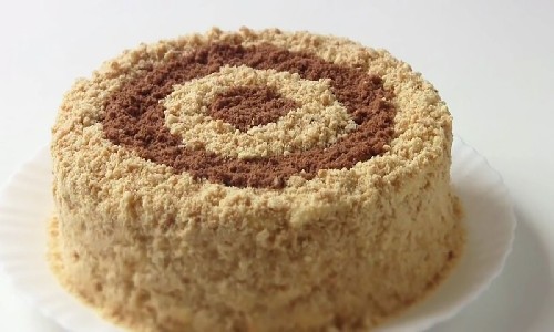 - We coaten elke cake royaal en stapelen deze op elkaar om een schilferige cake te vormen. We bedekken de bovenkant van de cake met room, evenals de zijkanten.