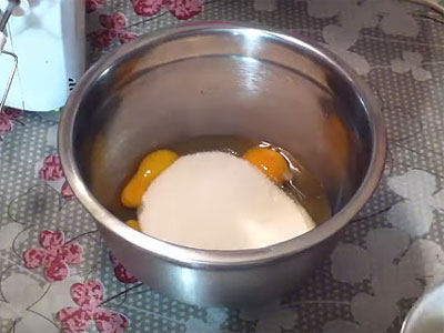 Laten we een diepe kom voor het deeg maken. Om te beginnen rijden we eieren, zout erin en voegen kristalsuiker in porties toe, malen het mengsel totdat de suiker volledig is opgelost.