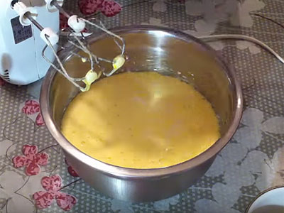 - Laten we beginnen met vullen. We rijden eieren in, mengen ze met suiker en voegen zure room toe. Meng grondig tot een homogene crème is gevormd.