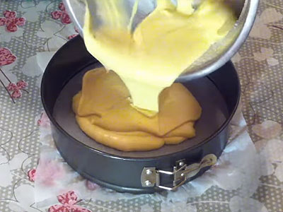 - Giet de room in een vorm en stuur deze naar de oven om 40-45 minuten te bakken. Het deeg moet goed bruin zijn, maar de vulling mag een beetje vloeibaar zijn, nadat de cake is afgekoeld zal de vulling dikker worden.