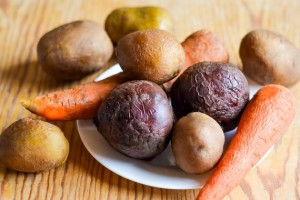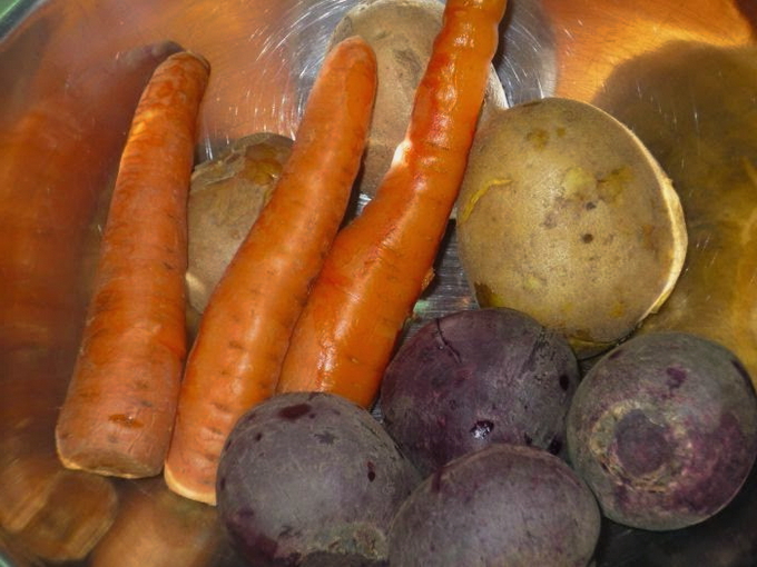 - Kook groenten (bieten, aardappelen en wortelen) voor tot ze gaar zijn, maar niet te gaar, afkoelen en schillen.
