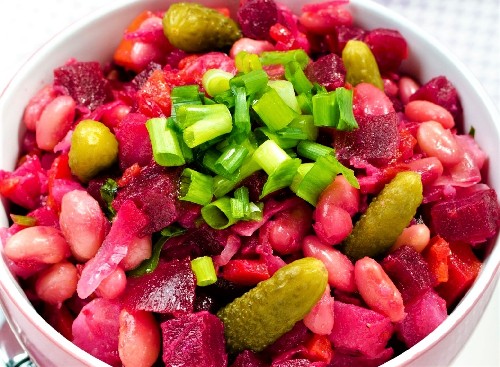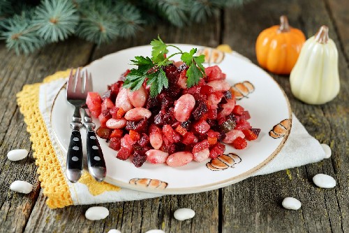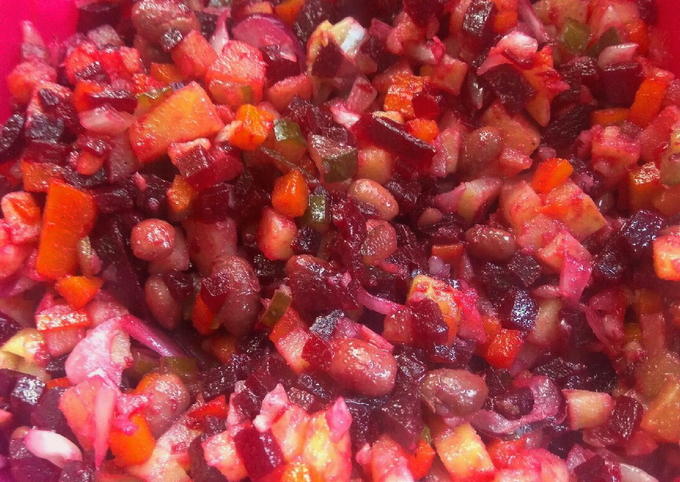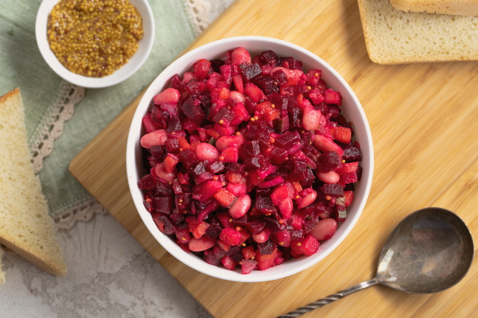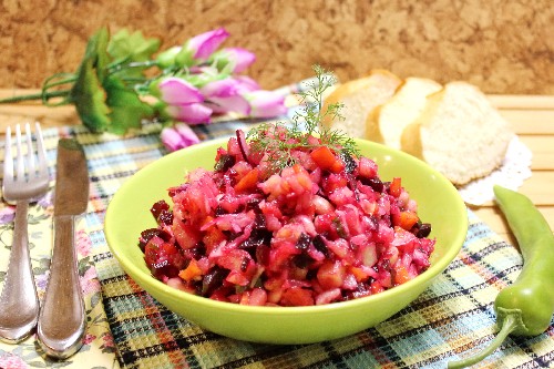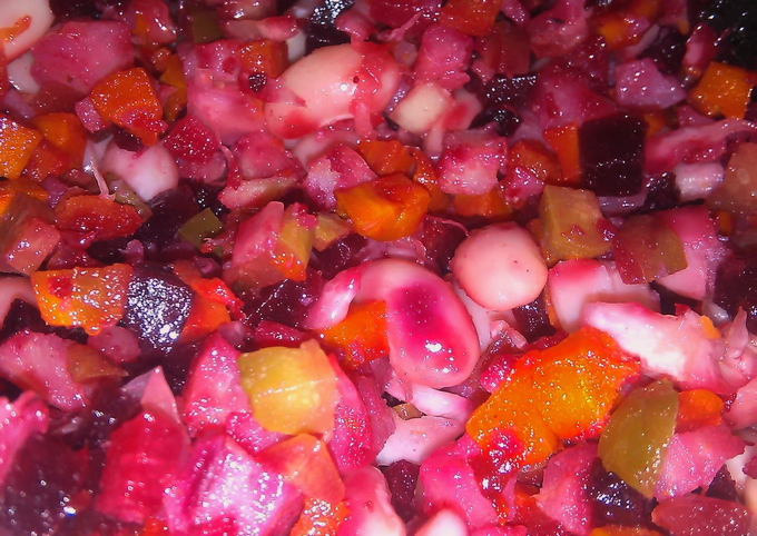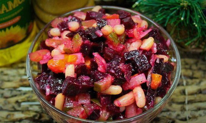De klassieke basis van elke vinaigrette is aardappelen, wortelen, augurken of zuurkool, uien en natuurlijk bieten. De rest van de ingrediënten kunnen worden toegevoegd of afgetrokken. In dit recept wordt u uitgenodigd om dit gerecht te bereiden met gekookte bonen en zuurkool.