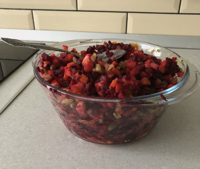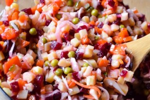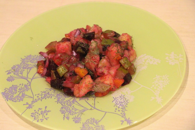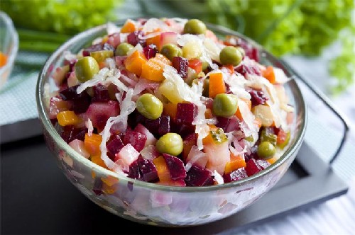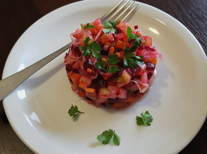 Uw aandacht gaat uit naar de zomerversie van de vinaigrette, wanneer er nog geen zuurkool en augurken zijn. Verse komkommers en kool voegen nieuwe smaken toe aan dit gerecht. Je kunt de gewenste zuurheid aan de salade toevoegen met citroensap of gewone zuring. Je maakt een uitstekend bijgerecht voor vlees- en visgerechten.