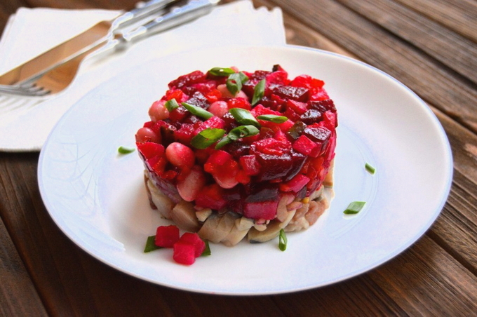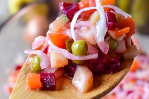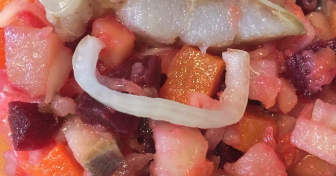 Een feestelijke versie van de vinaigrette wordt onder uw aandacht gebracht. Het wordt gekookt met haring. De geheimen van zijn verrukkingen zijn het vervangen van aardappelen door gekookte bonen, het fijn snijden van groenten en het gebruik van een mengsel van zonnebloem-, olijf- en lijnolie.