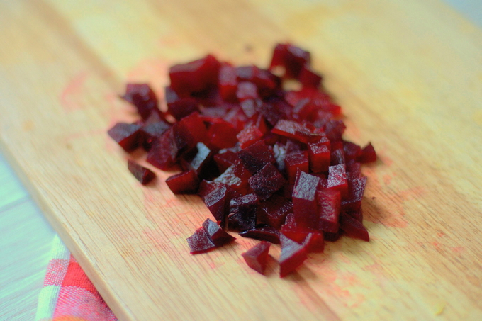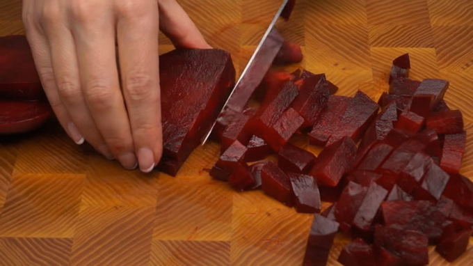 - Snijd de gekookte bieten en wortelen in blokjes ter grootte van een erwt.