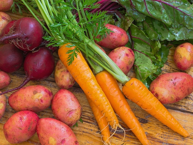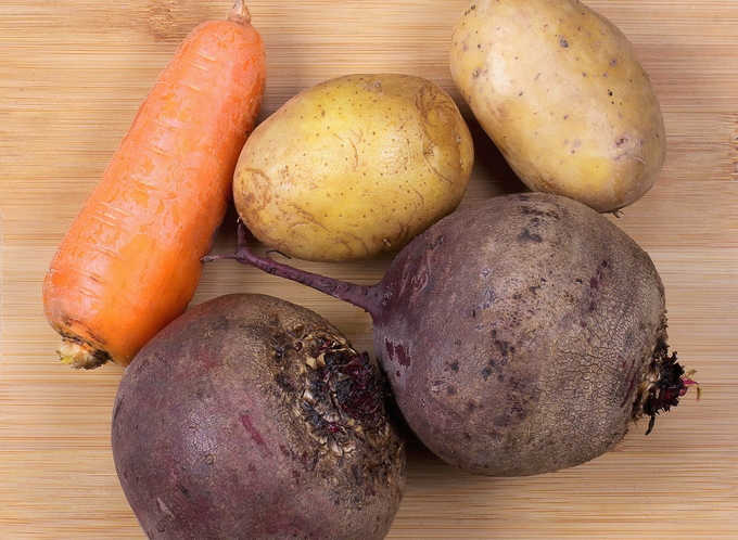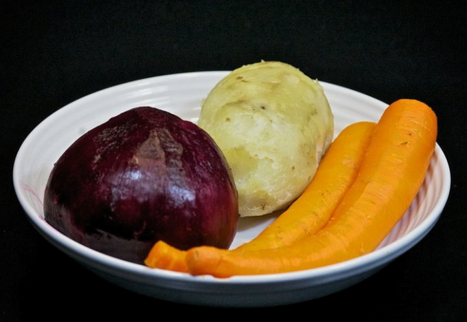 - Was en kook bieten, aardappelen en wortelen tot ze gaar zijn. Koel vervolgens de groenten af en schil ze.