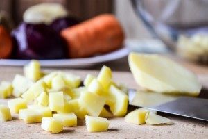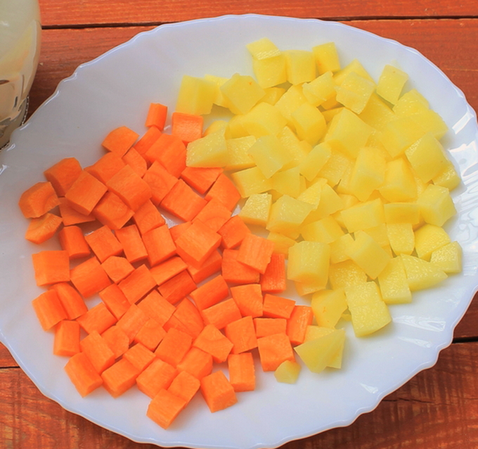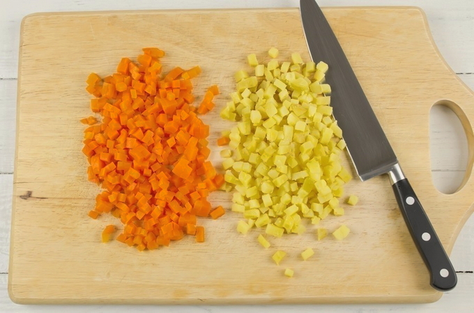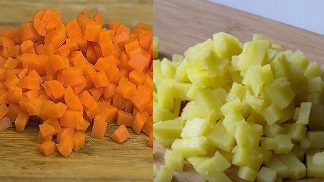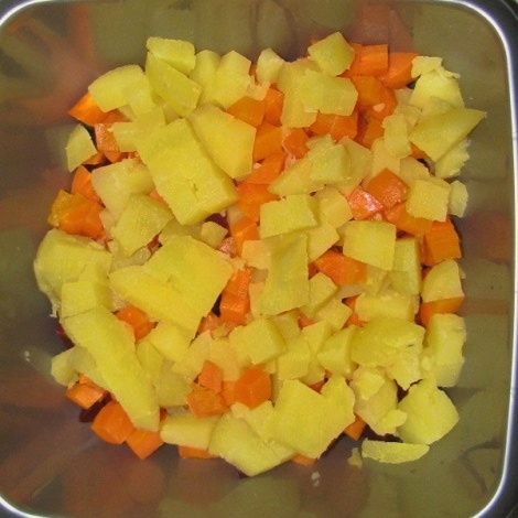 - Schil gekookte aardappelen en wortelen en snijd ze in kleine, gelijke blokjes.