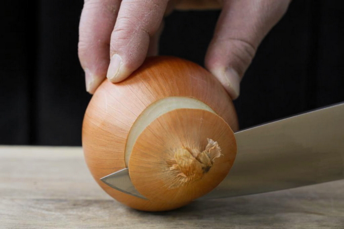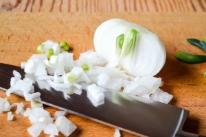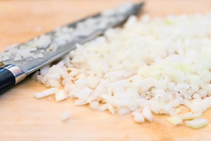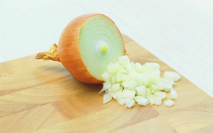 - Snijd de gepelde ui in kleine blokjes.