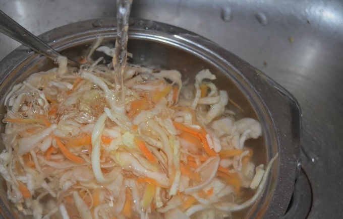 - Snijd de kool in dunne reepjes en maal een beetje met zout om sap te krijgen. Voeg het toe aan dezelfde container.