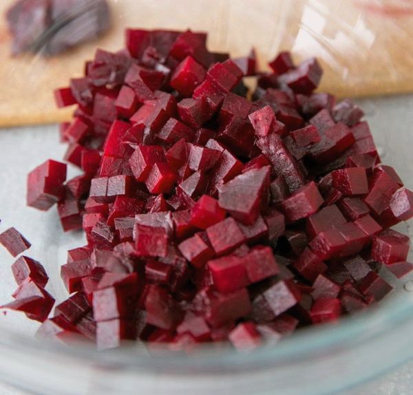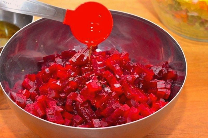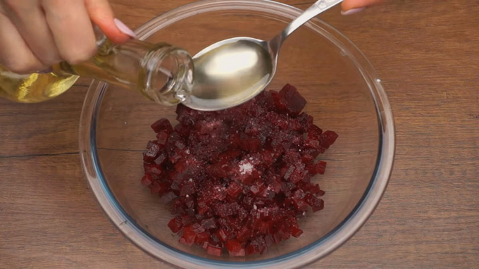 - Snijd de geschilde bieten in blokjes, doe ze in een kom om een salade te bereiden en meng ze met plantaardige olie om de rest van de ingrediënten niet te kleuren.