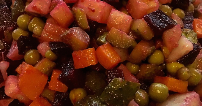 - Doe deze gehakte groenten in een vinaigrettepot, voeg er groene erwten uit blik aan toe en bedek ze met de gekookte aromatische dressing, laat 1/3 voor de bieten over.
