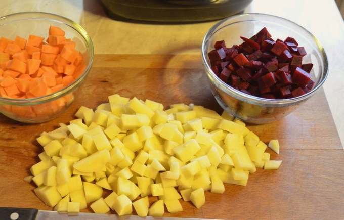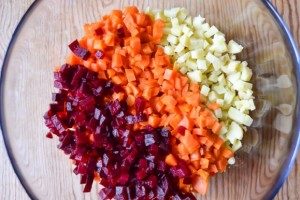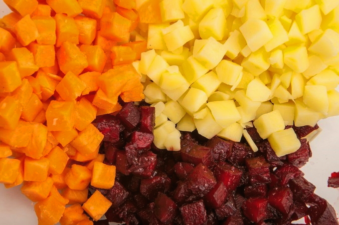 - Snijd alle gekookte groenten, behalve bieten, in kleine gelijke blokjes.