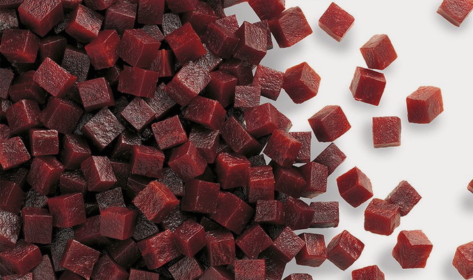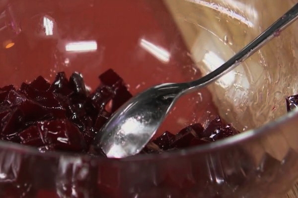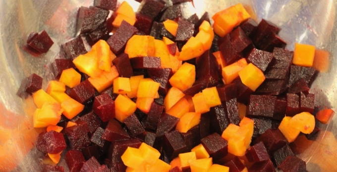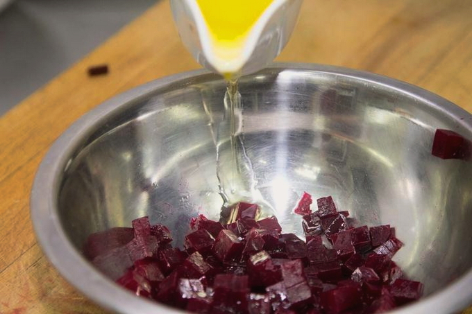 - Snijd de bieten in dezelfde blokjes en meng ze met plantaardige olie in een aparte kom, zodat ze geen vlekken op ander voedsel maken.