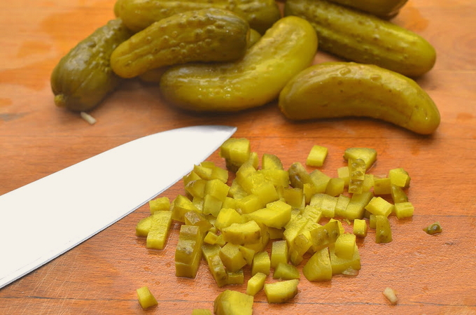 - Snijd de augurken in kleinere blokjes die witter zijn dan de rest van de groenten.