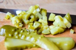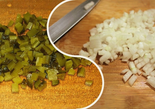 - Snijd de gepelde uien en augurken op dezelfde manier.